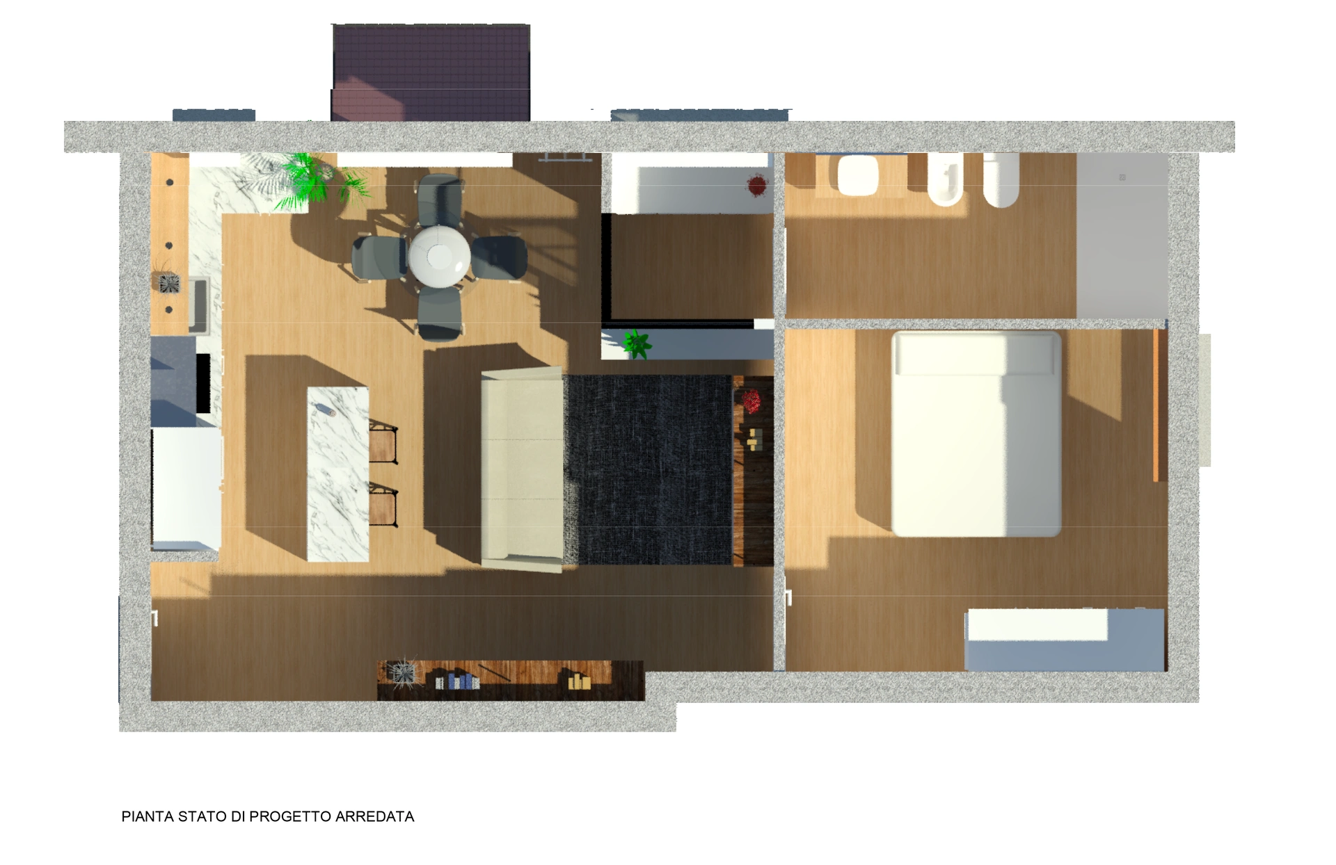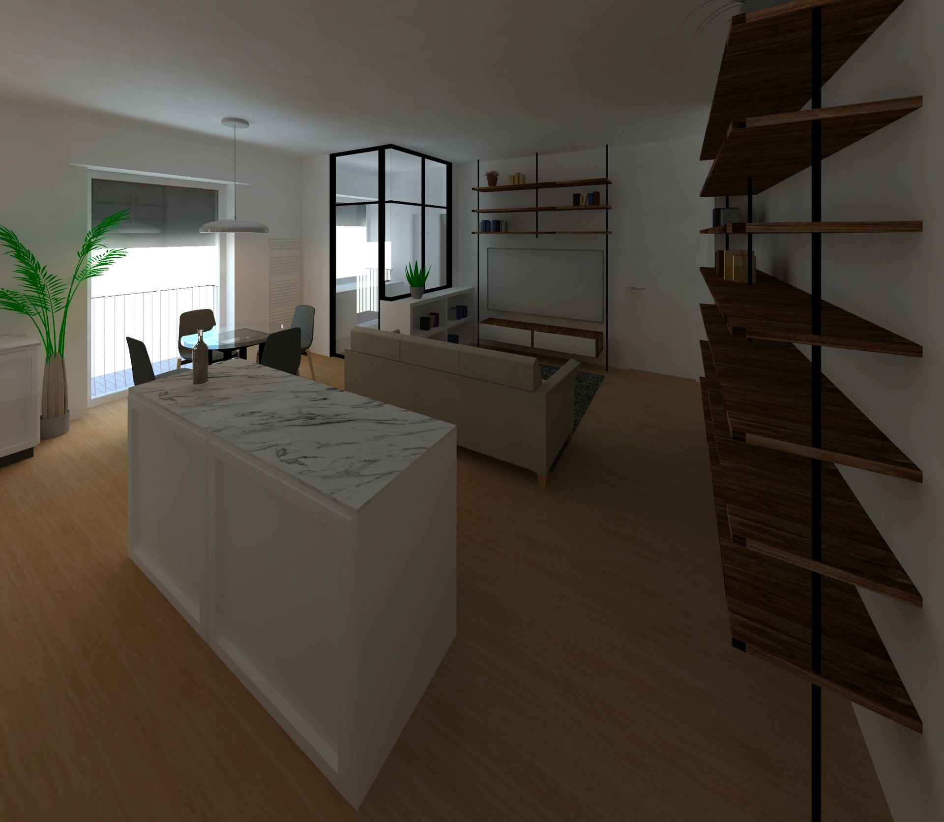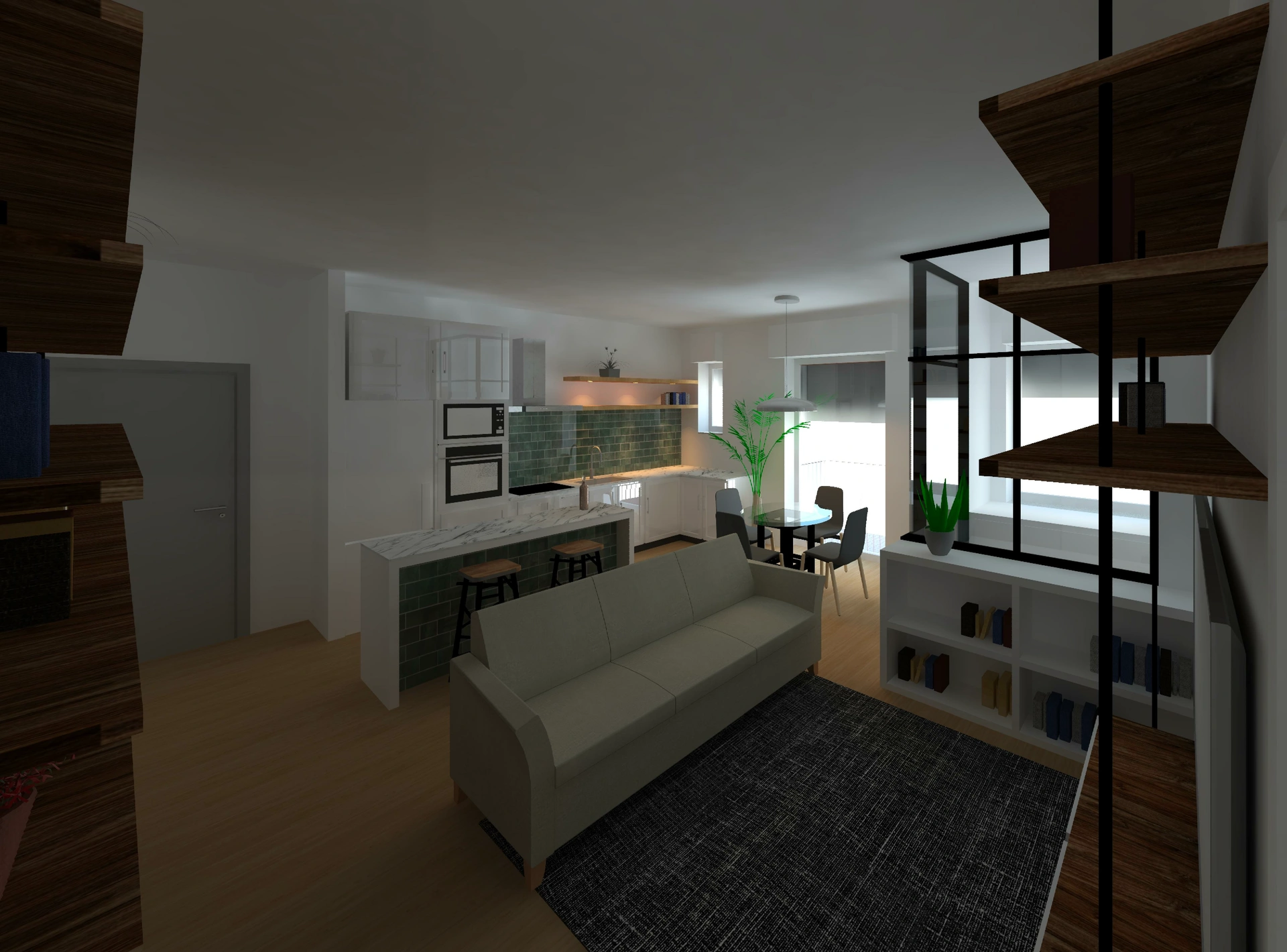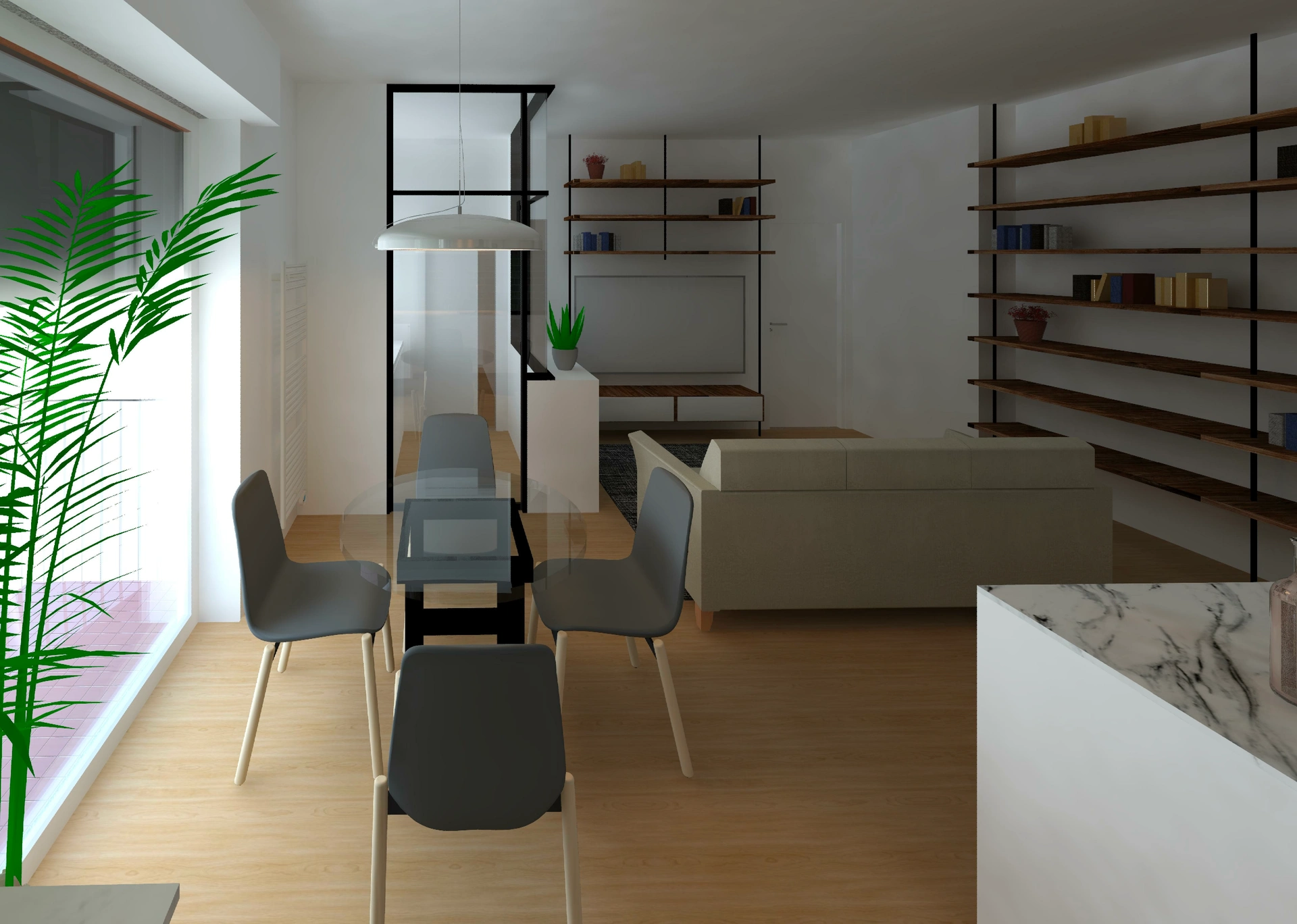 Il progetto ha previsto la completa ridefinizione della zona giorno tramite la creazione di un ampio open space che integra cucina, pranzo e soggiorno. L’intervento ha comportato la demolizione di tramezzi esistenti, l’inserimento di elementi leggeri in vetro e ferro e la realizzazione di arredi su misura. L’obiettivo è stato quello di massimizzare la luminosità naturale e migliorare la fruibilità degli spazi, con una distribuzione più fluida e contemporanea.